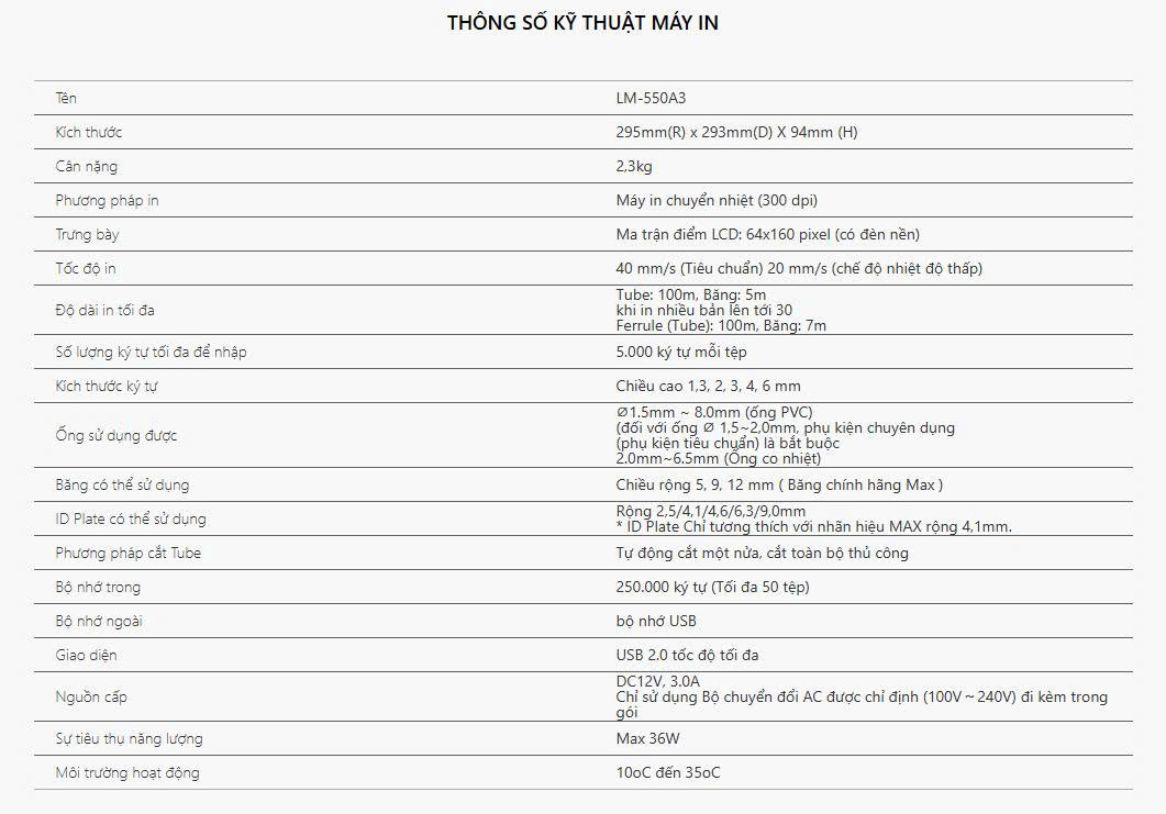 LM-550A3/PC là thế hệ máy in đánh dấu dây tiên tiến mới nhất từ MAX - phiên bản nâng cấp hoàn hảo thay thế cho dòng LM-550A2/PC. Với tốc độ in vượt trội, công nghệ nhập dữ liệu thông minh và khả năng kết nối linh hoạt, thiết bị giúp việc đánh dấu dây - đầu cos trở nên nhanh chóng, chính xác và chuyên nghiệp hơn bao giờ hết. LM-55A3/PC là thế hệ máy in đánh dấu dây tiên tiến mới nhất từ MAX - Phiên bản nâng cấp hoàn hảo thay thế cho dòng LM-550A2/PC. Với tốc độ in vượt trội, công nghệ nhập giữ liệu thông minh và khả năng kết nối linh hoạt, thiết bị giúp việc đánh dấu dây - đầu cos trở nên nhanh chóng, chính xác và chuyên nghiệp hơn bao giờ hết .